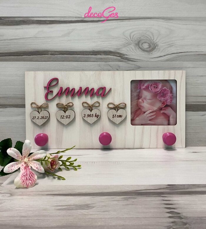 *Corazones en madera de roble con acabado blanco decapé y grabado personalizado de datos de nacimiento. Si deseas alguna otra personalización en el texto de los corazones, indícalo en la NOTA del pedido antes de finalizar.