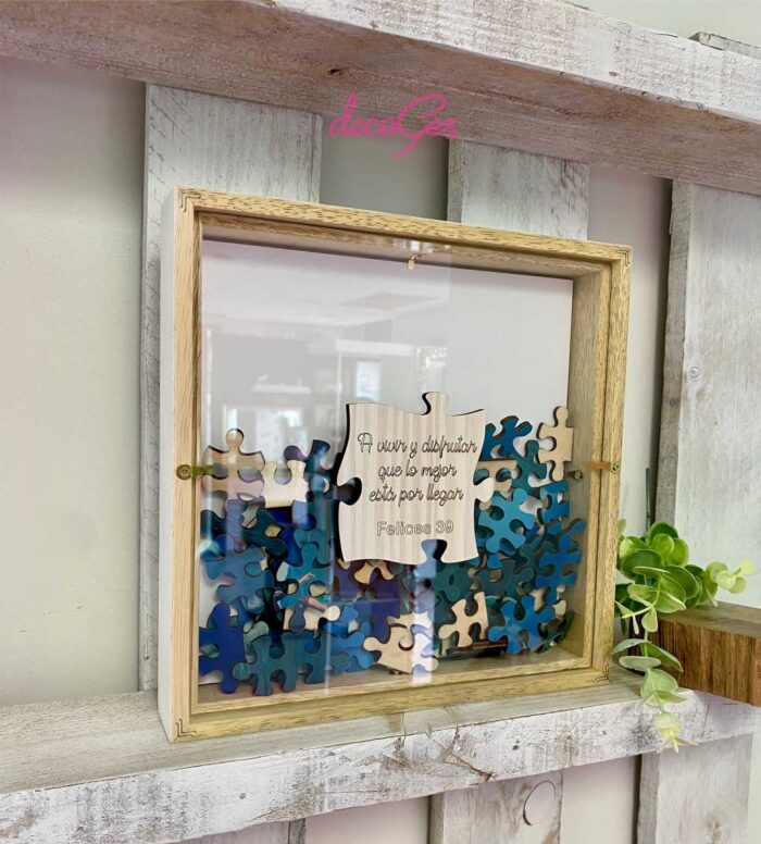 - Por la parte de atrás cerramos con un cristal para que se vean las piezas, nos parece diferente y elegante, y lleva una pieza de puzzle grabada donde podrás poner la dedicatoria que quieras.