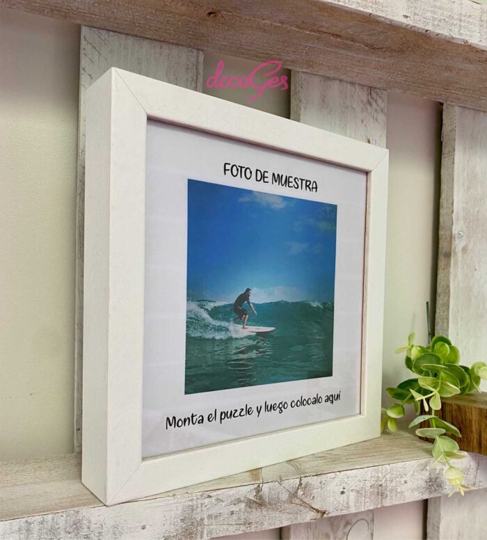 -Medida puzzle: 20x20cm. Lleva cristal. Elige una foto que se adapte al formato y adjúntala para imprimirla sobre la madera, que es especial para estampar. Tiene un acabado como envejecido que le dá muchísima personalidad.